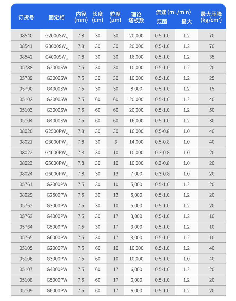 TSK-GEL PW系列色譜柱部分填料的種類及特性