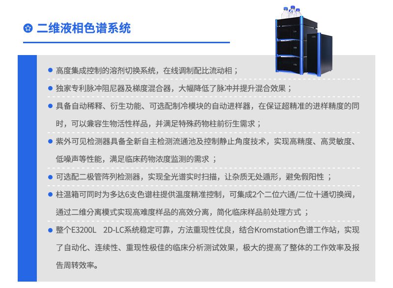 依利特二維液相色譜系統(tǒng)(以下簡稱E3200L2D-LC)依托于公司完全自主研制開發(fā)的EClassical3200L HPLC/UHPLC液相色譜儀平臺(tái)(以下簡稱E3200L),通過對(duì)其進(jìn)行全新系統(tǒng)升級(jí)和軟硬件集成。