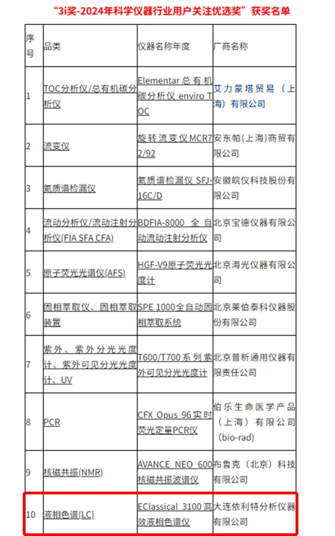 2025年5月12日,第十八屆中國科學(xué)儀器發(fā)展年會(ACCSI2025)在上海盛大開幕。大會吸引超1700位科學(xué)儀器行業(yè)相關(guān)政府領(lǐng)導(dǎo)、院士專家、儀器企業(yè)CEO、檢測機構(gòu)負責(zé)人、投資人、媒體記者等參會,會議規(guī)模再創(chuàng)新高。備受矚目的“儀器及檢測3i獎頒獎典禮”于當晚隆重舉行,在行業(yè)內(nèi)人士的見證下,“3i獎-2024年度科學(xué)儀器行業(yè)用戶關(guān)注優(yōu)選獎”獲獎名單揭曉,其中依利特科技EClassical 3100 高效液相色譜儀獲此殊榮。