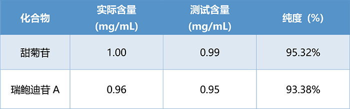 2、分離純化效能: 選擇甜菊糖苷中高價(jià)值組分——甜菊苷和瑞鮑迪苷A作為測(cè)試樣品,設(shè)備自動(dòng)進(jìn)樣10mL樣品,利用其時(shí)間+閾值方法精準(zhǔn)收集目標(biāo)餾分。如下表所示,純度均高于93%,相比文獻(xiàn)報(bào)道的傳統(tǒng)三步樹脂法(~92.9%)更具優(yōu)勢(shì)。證明了設(shè)備在快速分離、穩(wěn)定輸出、精準(zhǔn)收集上的性能,顯著提升產(chǎn)品純度和效率。