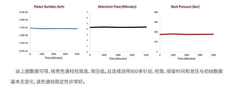 在相同的色譜條件下,核殼色譜柱可以超過大多數(shù)亞2μm多孔型色譜柱的柱效,且柱壓只有亞2μm多孔型色譜柱的一半。由于實(shí)心核的存在,樣品分子傳質(zhì)路徑短,極大的提高了分析速度??梢詫?shí)現(xiàn)在常規(guī)HPLC上,獲得超高的柱效和更快的分離。