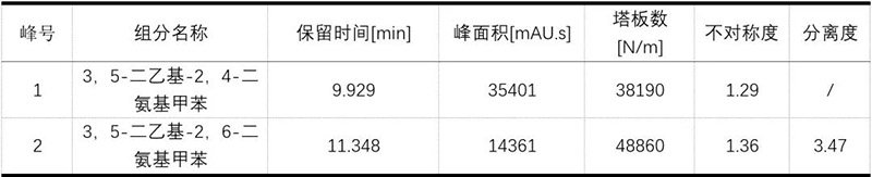 依利特新款的EClassical3200液相色譜儀搭配經典的SinoPak C18色譜柱,對二乙基甲苯二胺同分異構體進行分析,分離度非常好,柱效也很高,滿足定性定量分析的需求。