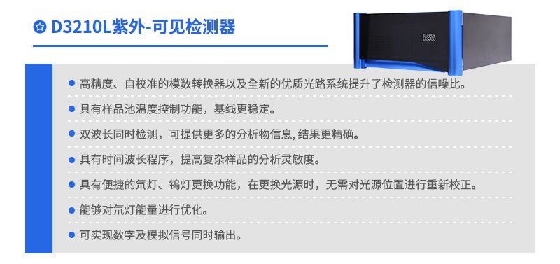 EClassical D3210L紫外-可見(jiàn)檢測(cè)器是依利特推出的 EClassical 3200L 系列產(chǎn)品之一。配備了氘燈和鎢燈兩種光源,增加了雙波長(zhǎng)功能。