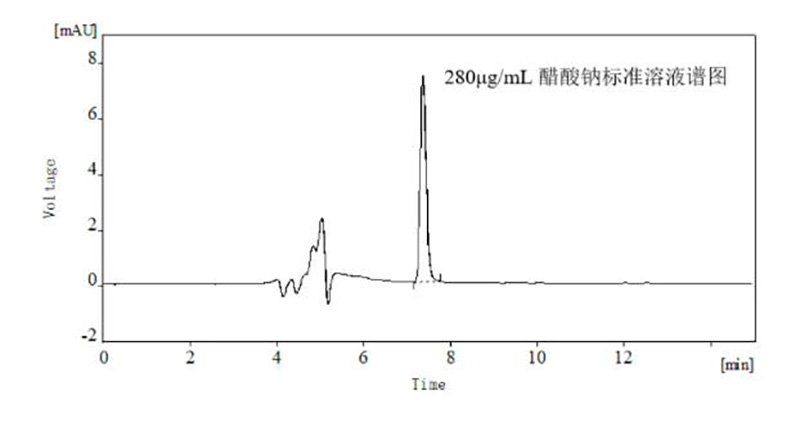 精準稱取醋酸鈉25mg,精確至0.0001g,用水溶解,配制成1000μg/mL儲備液;并用水稀釋成120μg/mL、160μg/mL、200μg/mL、240μg/mL、280μg/mL的工作液。