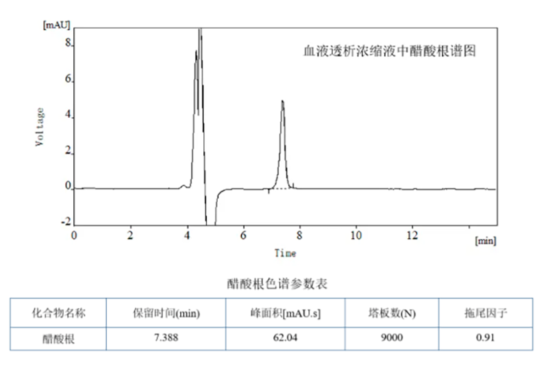 醋酸根:按A:B:水:流動相=1:1.225:16.388:16.387(v/v)的比例稀釋,以0.45μm膜過濾,測定。