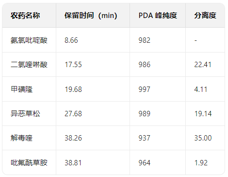 6 種農(nóng)藥實現(xiàn)基線分離,分離度均>1.5,峰純度優(yōu)異,關(guān)鍵參數(shù)如下: