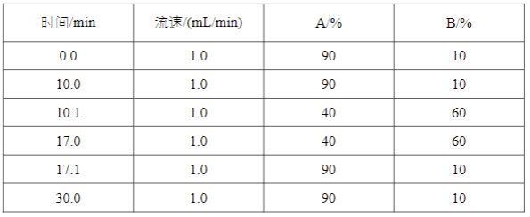流動(dòng)相組成(Mobile phase, V/V):A:0.2% 磷酸溶液(pH=1.82);B: 乙腈