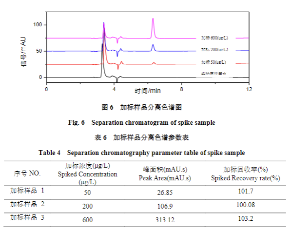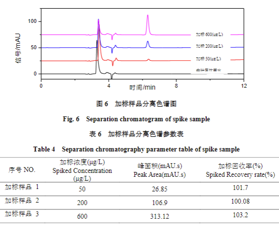 將實(shí)際樣品(實(shí)驗(yàn)室飲用水)、加標(biāo)樣品 1(50 μg/L)、加標(biāo)樣品 2(200 μg/L)、加標(biāo)樣品 3(600 μg/L)按 1.2 實(shí)驗(yàn)條件進(jìn)樣分析,所得計(jì)算結(jié)果如下所示: