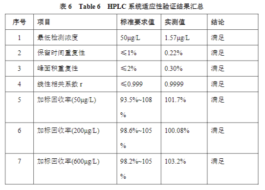 丙烯酸標(biāo)準(zhǔn)品采用依利特 iChrom5100 系統(tǒng)及 Supersil ODS2 5μm,ID4.6×250mm 色譜柱所測(cè)得的各項(xiàng)指標(biāo)均滿(mǎn)足系統(tǒng)適用性要求,具體如下表所示: