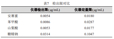 噪聲按 0.01mV 計(jì)算,峰高為 3 倍信噪比對應(yīng)的濃度為儀器檢出限,10 倍信噪比對應(yīng)的濃度為儀器定量限,結(jié)果如下表所示: