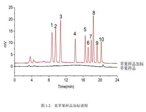 (橫坐標為時間 min,縱坐標為信號 mV;含 “蘋果樣品”“蘋果樣品加標” 兩條曲線,標注 10 種農(nóng)藥對應峰)