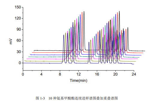 圖 1-3 10 種氨基甲酸酯連續(xù)進樣譜圖疊加重疊譜圖