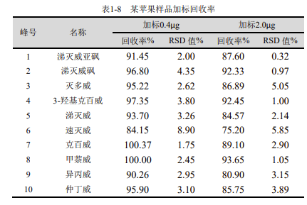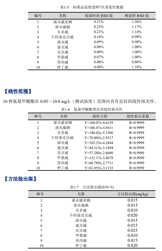 大連依利特分析儀器有限公司,結合《NY/T 761-2008 蔬菜和水果中有機磷、有機氯、擬除蟲菊酯和氨基甲酸酯類農(nóng)藥多殘留的測定》方法及相關文獻中關于農(nóng)殘測定的要求,建立的氨基甲酸酯分析系統(tǒng),提出了蔬果中氨基甲酸酯類農(nóng)藥殘留檢測的全套解決方案,并以蘋果為樣品進行了檢測,實驗結果能夠達到標準中各項指標要求。