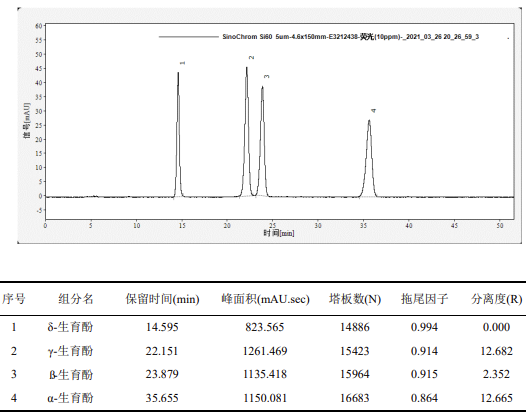 維生素 E 標(biāo)準(zhǔn)儲(chǔ)備溶液(1.000mg/mL):分別準(zhǔn)確稱(chēng)取 α- 生育酚、β- 生育酚、γ- 生育酚和 δ- 生育酚各 50.0mg,用無(wú)水乙醇溶解后,轉(zhuǎn)移入 50mL 容量瓶中,定容至刻度,此溶液濃度約為 1.00mg/mL。將溶液轉(zhuǎn)移至棕色試劑瓶中,密封后在 - 20℃下避光保存,有效期 6 個(gè)月。