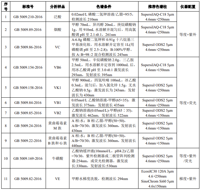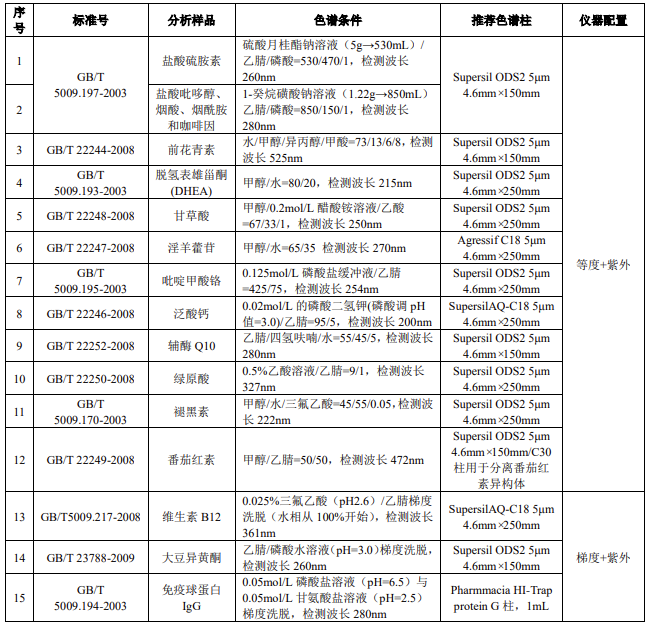 4.1 保健品中常見(jiàn)分析物質(zhì)的色譜柱推薦及儀器配置 ......................... 14