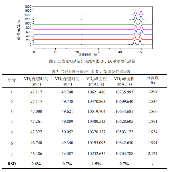 根據(jù)以上實驗數(shù)據(jù),Kromstation 色譜數(shù)據(jù)工作站可以實現(xiàn)對 EClassical 3200L 二維系統(tǒng)的全反控。根據(jù) GB 5009.296-2023《食品安全國家標準 食品中維生素 D 的測定》第二法:在線柱切換 - 反相液相色譜法(二維液相色譜法)分離維生素D_2、D_3,Kromstation 色譜數(shù)據(jù)工作站可以自動實現(xiàn)二維系統(tǒng)的閥切換完成維生素D_2、D_3的分離,且實驗結果具有良好的重復性和分離度,滿足對維生素 D 同分異構體的分離檢測需求。