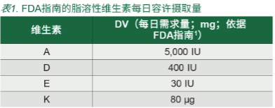 維生素是人體內(nèi)各種代謝功能所必需的微量營養(yǎng)素。維生素可分為水溶性和脂溶性維生素。脂溶性維生素 (FSV) 主要由維生素 A、D、E 和 K 組成,儲存在肝臟和脂肪組織中,消除速率比水溶性維生素慢。因此,人體不需要經(jīng)常補充 FSV。FDA 建議人體 FSV 推薦攝入量 / 耐受量見表 1。