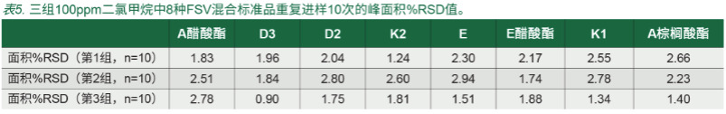 如圖 1 所示,在不到 15 分鐘的時間內(nèi)實現(xiàn)了 8 種維生素良好色譜分離,如圖 2 所示,5 次重復(fù)檢測的重疊顯示了出色的色譜重現(xiàn)性。三組 10 次重復(fù)進(jìn)樣使用二氯甲烷制備的 100μg/mL FSV 標(biāo)準(zhǔn)品,所有峰面積的 % RSD 均小于 3%(表 5)。這表明進(jìn)樣之間擁有出色的重現(xiàn)性。