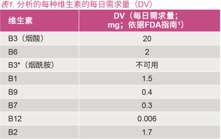由于美國(guó)食品藥品監(jiān)督管理局 (FDA) 制定了這些維生素的每日營(yíng)養(yǎng)推薦值,因此食品和補(bǔ)充劑生產(chǎn)商以及獨(dú)立檢測(cè)實(shí)驗(yàn)室需要能夠定量鑒定該類(lèi)產(chǎn)品中的維生素含量。在進(jìn)行強(qiáng)化食品分析時(shí),由于維生素濃度范圍較廣,與每日容許攝取量保持一致尤其具有挑戰(zhàn)性 (見(jiàn)表 1)。例如,在嬰兒牛奶中,維生素 B12 (氰鈷維生素) 的濃度為 1-2ppb,而維生素 B2 (核黃素) 的濃度則高達(dá) 1000 倍 (1-2 pm)。因此,任何定量分析方法都必須能夠適應(yīng)這種廣泛的濃度分布。