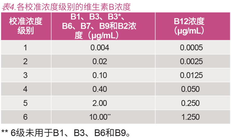 通過(guò)對(duì)工作標(biāo)準(zhǔn)品進(jìn)行連續(xù)稀釋,制備 6 個(gè)校準(zhǔn)濃度級(jí)別。獲得的維生素濃度見(jiàn)表 4。由于維生素 B12 的 DV 指南值明顯較低 (0.006mg),因此使用較低的濃度范圍對(duì)其進(jìn)行校準(zhǔn)。每批樣品運(yùn)行前,分別移取各校準(zhǔn)濃度級(jí)別標(biāo)準(zhǔn)溶液 50mL 至 50mL 容量瓶中,加入 50μL ISTD B1、B2 和 250μL ISTD B7,使內(nèi)標(biāo)濃度為 0.1ug/mL。注:如果可用的任何校準(zhǔn)濃度級(jí)別標(biāo)準(zhǔn)溶液低于 50mL,ISTD 應(yīng)相對(duì)可用量成比例添加。所有校準(zhǔn)物均一式三份進(jìn)樣。?