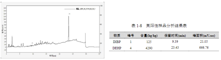 由表 1-8 知:檢測樣品中含鄰苯二甲酸二異丁酯 (DIBP) 125mg/kg,鄰苯二甲酸二 - 2 - 乙基己酯 (DEHP) 4290mg/kg,鄰苯二甲酸丁芐酯 (BBP) 和鄰苯二甲酸二丁酯 (DBP) 未檢出。