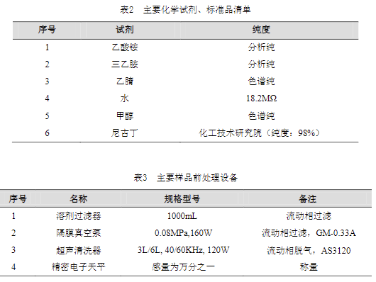 實(shí)驗(yàn)過(guò)程中其它玻璃器皿還包括容量瓶 (100mL、50mL、25mL、10mL)、移液槍 (0~1000μL,0~5000μL)、移液槍槍頭 (1mL,5mL)、一次性 PVC 手套、一次性口罩、進(jìn)樣針、樣品瓶、濾膜等若干。