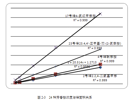 圖 2-3 為選擇 24 種芳香胺中的 4 種,并給出其濃度與峰面積的關(guān)系。