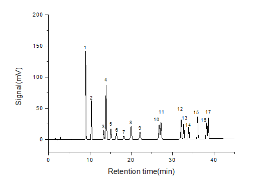 | 峰號 | 物質(zhì) | 保留時(min) | 峰面(mV·sec) | 不對稱度 | 塔板數(shù)(N/m) |