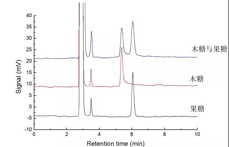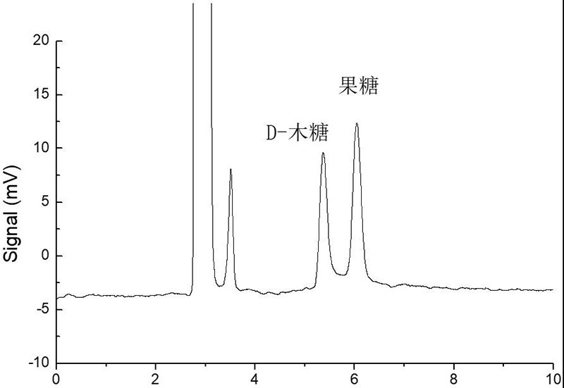 D-木糖與果糖濃度分別為1mg/mL與0.2mg/mL的混標(biāo)進(jìn)樣,圖譜如下: