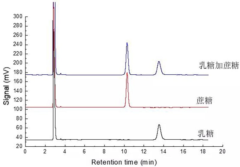 圖2 蔗糖及乳糖混合標(biāo)準(zhǔn)品,蔗糖,乳糖單標(biāo)疊加色譜圖