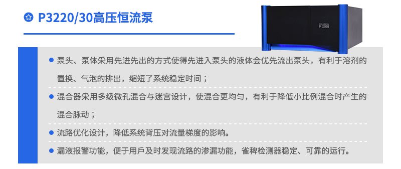 具有流量穩(wěn)定、流量脈動(dòng)低;流量梯度準(zhǔn)確、梯度重復(fù)性佳,滯后體積小等特點(diǎn),極大程度的保證實(shí)驗(yàn)的重復(fù)性。提供流動(dòng)相選擇、流動(dòng)相脫氣等功能,實(shí)現(xiàn)在無(wú)人值守下自動(dòng)完成流動(dòng)相的更換。