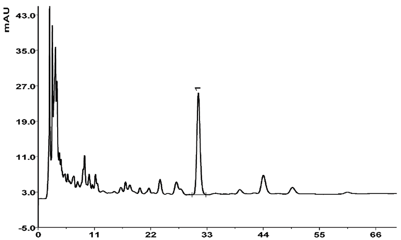 依利特新款的EClassical 3200液相色譜儀搭配經(jīng)典的Supersil ODS-B色譜柱,對(duì)三白草樣品進(jìn)行分析,峰型較好,分離度高,滿足定性定量分析的需求。