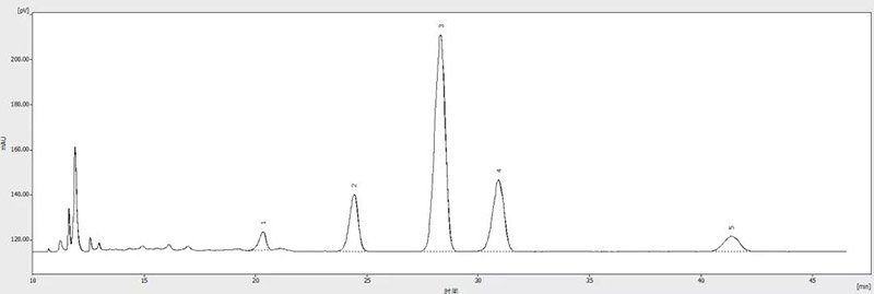 銀杏葉為銀杏科植物銀杏的葉片,含有大量的銀杏黃酮和萜類內(nèi)脂,是一種具有很高藥用價(jià)值的植物。銀杏葉具有斂肺,平喘,活血化瘀,止痛的功效。銀杏葉中的萜類內(nèi)酯對(duì)血小板活化因子(PAF)受體有強(qiáng)大的特異性抑制作用,被認(rèn)為是有臨床應(yīng)用前景的天然PAF受體拮抗劑。依利特用新推出的D3270蒸發(fā)光散射檢測器匹配熱銷的Supersil ODS2色譜柱,對(duì)銀杏葉中萜類內(nèi)酯的含量進(jìn)行分析檢測。